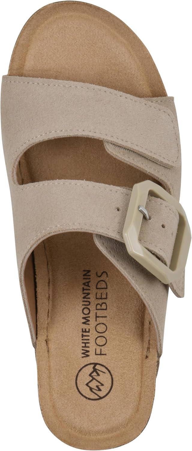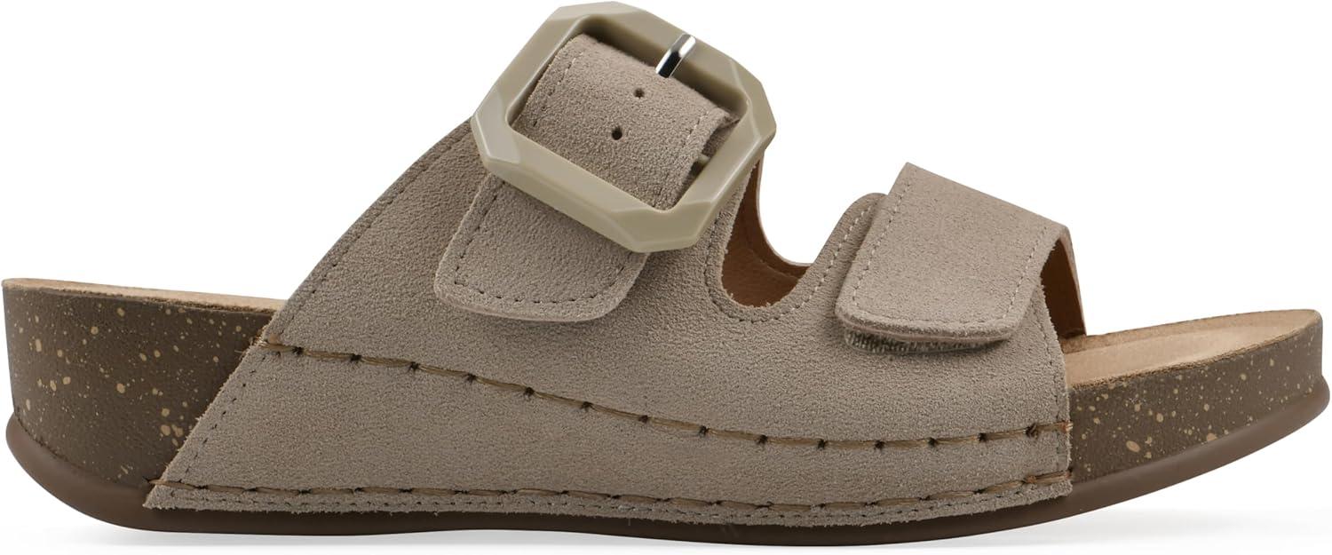 The Fearful wedge sandal from White Mountain Shoes will elevate your style. The contoured cork-like outsole features a cushiony footbed, designed with comfort in mind. Two bands are adjustable for a custom fit. The back strap has a modern buckle, and the front strap has a Velcro closure. The easy slip-on design is perfect for the woman who is on the go. You will not be fearful in the Fearful wedge slide sandal!