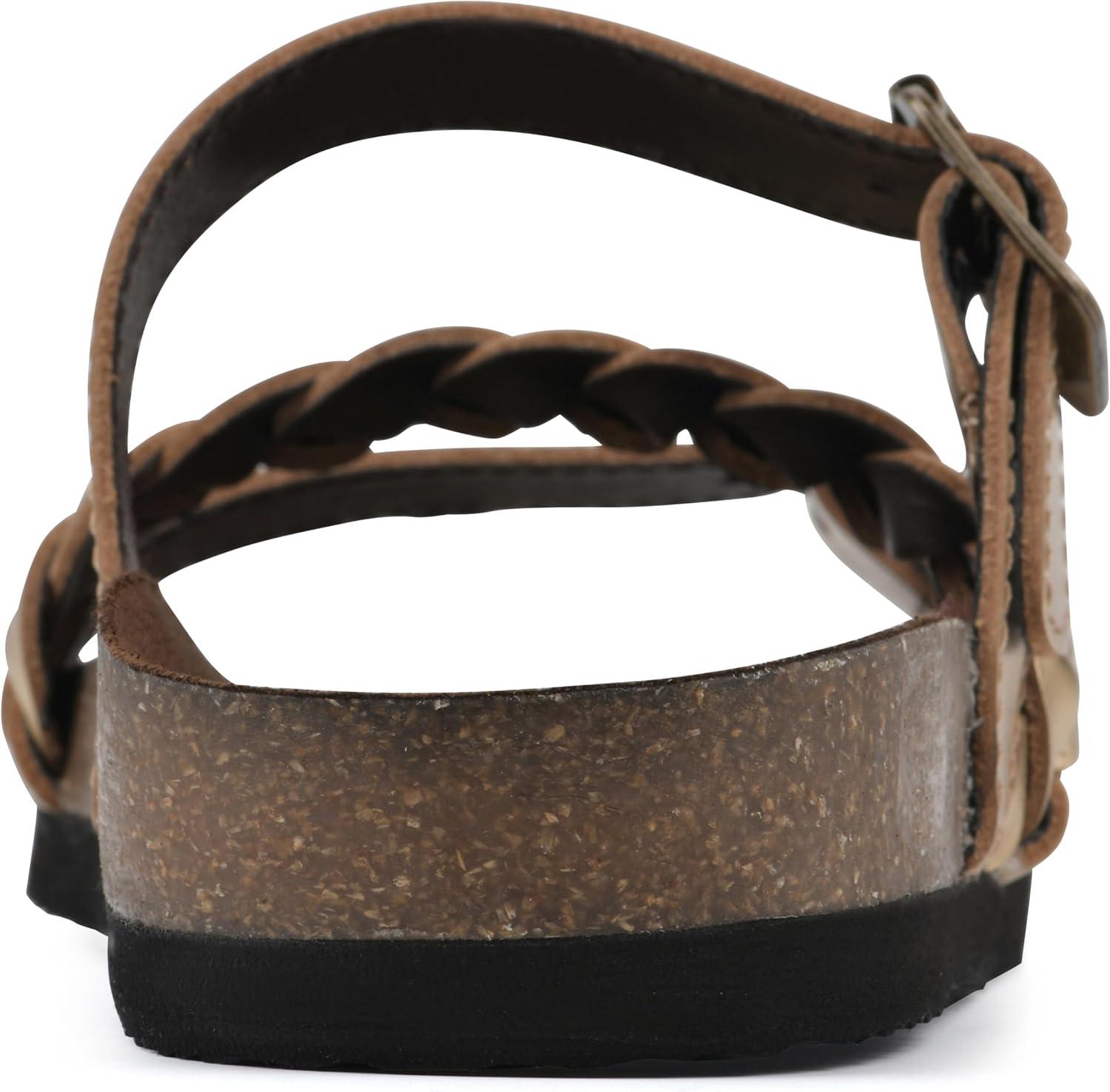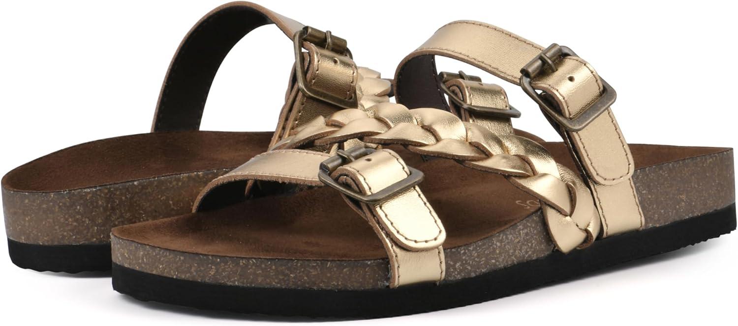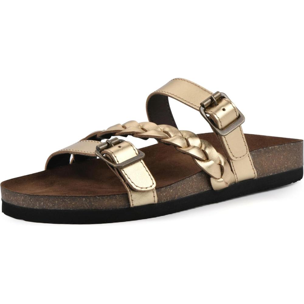 The molded suedette footbed Huntington slide sandal by White Mountain shoes is crafted with genuine leather straps and two adjustable buckles. The braided middle strap adds a playful feminine touch to these ultra comfortable slip on sandals. Heel height 1″