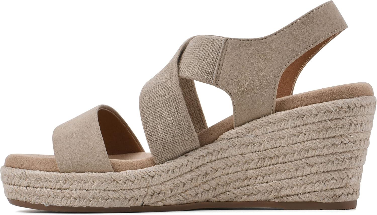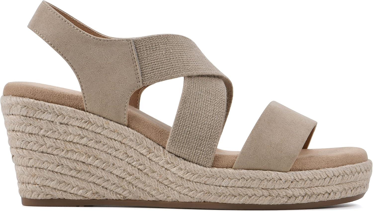 The Yanda wedge by White Mountain Shoes stretches to fit with its elastic crisscross straps! These stretchy straps hug the foot and make this wedge easy to take on and off. The wedge is wrapped in jute and made complete with a padded insole for premium comfort.